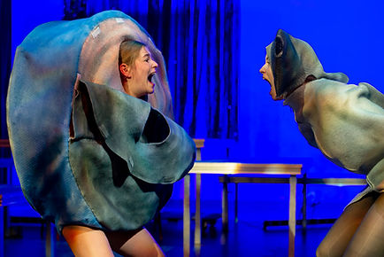 'Hoe Bewaar je luchtbellen', (translatable to 'How Do I Save Bubbles') was written by Maxine Palit-de Jongh, this text is set at the bottom of the sea. With a hungry hammerhead shark, an ambitious shrimp and a melancholic can of tuna. This scene comes from improvisations by the actors, in which they thought about what they would be if they were an animal or food. To this one of the actresses responded with a can of tuna, to which I responded by designing a costume for a can of tuna. When the writer saw this design, the direction of the scene was set, and she wrote the rest of the scene around the concept of the tuna can.